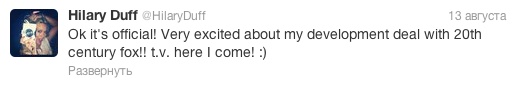 Хилари Дафф два дня назад написала в Twitter по поводу съемок в сериале "Это официально! Я очень взволновала по поводу моей сделки с компанией 20th Century Fox! Телевидение, жди меня!":