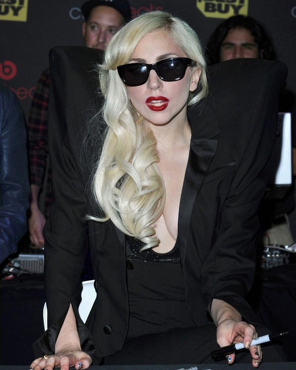 На презентации своего нового альбома "The Fame Monster" Леди Гага шокировала всех своим необычным нарядом. На первый взгляд, ее внешний вид полностью соответствовал дресскоду мероприятия: строгий черный брючный костюм, скромная прическа и обычная обувь. Но внимание привлекли необычайно широкие и высокие плечи, которые получились из-за специальной накладки под пиджак.