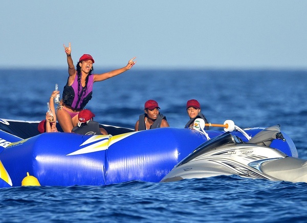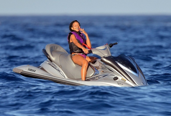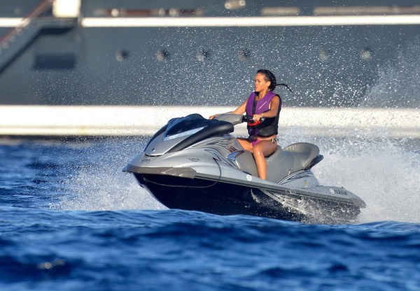 В субботу фотографам удалось заснять Рианну в расслабленной обстановке, а заодно посмотреть, как умеет "отрываться" эта красавица не только на сцене, но и в реальной жизни. В тот день на певице было сексуальное бикини, в котором Рианна чувствовала себя очень комфортно, и спасательный жилет для поездки на водном мотоцикле. Потягивая пиво "Coronas", популярная исполнительница заметила папарацци и не могла упустить возможность показать им "широкий жест".